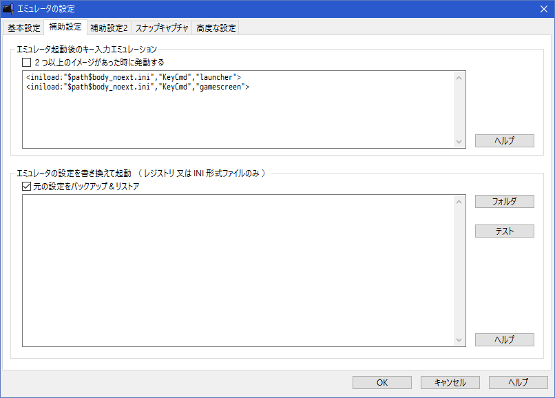そして エミュレータ起動後のキー入力エミュレーション エディットボックスは次のように修正して、iniファイル内のコマンドがインクルードされるようにします。
