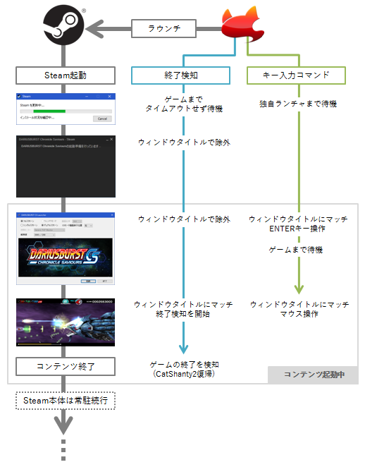 前回の「タイムアウトをしないで待機」で同様の説明をしましたが、この独自ランチャのウィンドウタイトルによって CatShatny2 はコンテンツが起動したと判断し、終了検知を開始してしまいます。